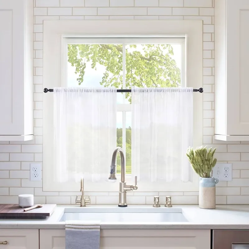 Sheer white cafe curtains covering the lower half of a kitchen window.