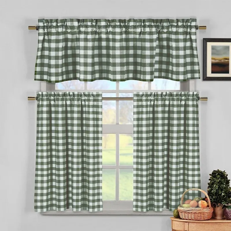 Green and white cafe curtain, gingham checkered kitchen curtains.
