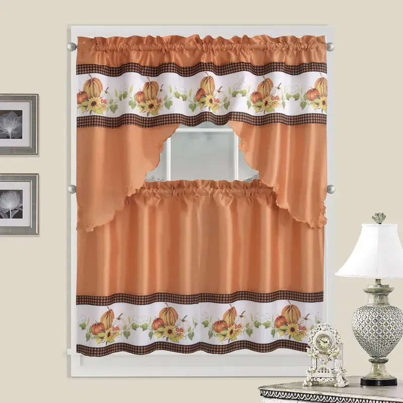 Orange polyester kitchen curtains with a fall pumpkin and sunflower design.