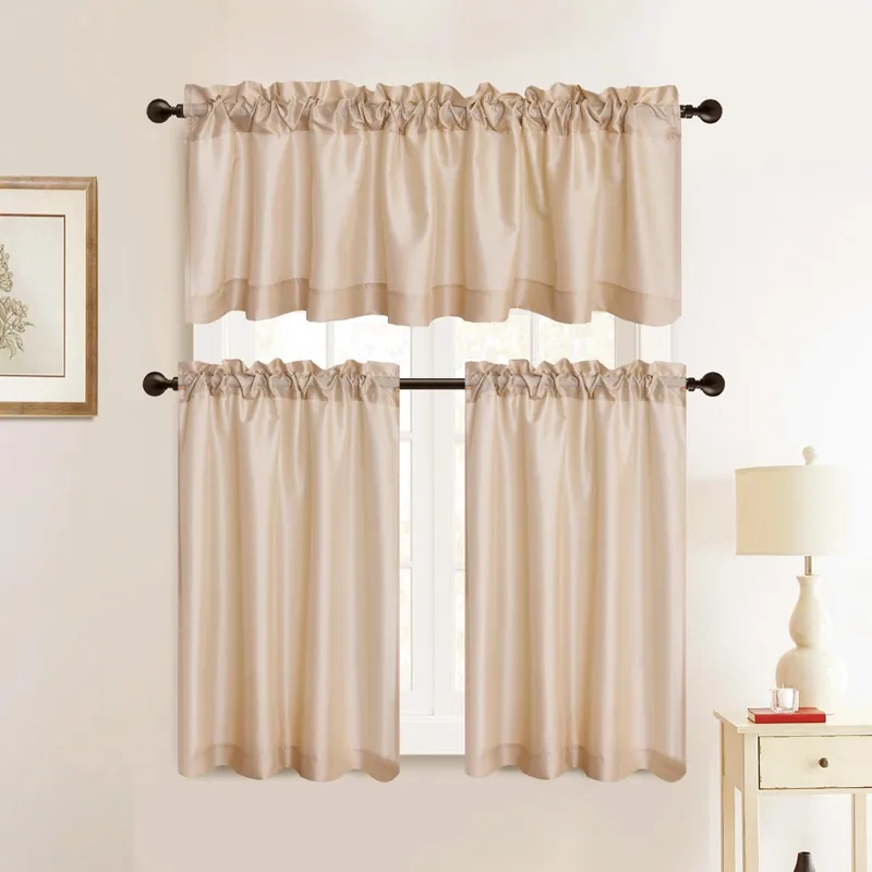 Beige faux silk kitchen curtains with a valance and two tiers.