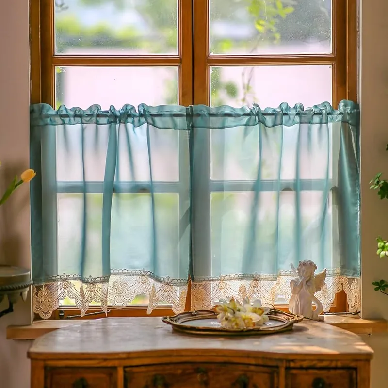 Sheer aqua blue chiffon cafe curtains with lace trim.